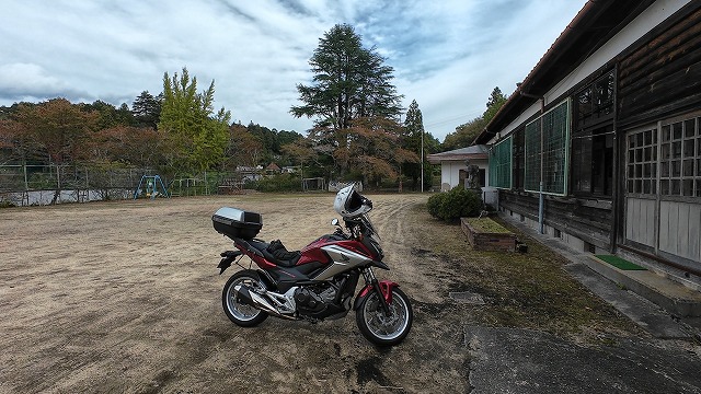 無事に校庭のグラウンドへ辿り着いても、バイク乗りにはもう一つ関門がある。地面が土なので、そのまま停めるとサイドスタンドがめり込んで転倒する恐れがあるのだ。特にこうした廃校の校庭やキャンプ場のような場所では、スタンドの沈み込みは命取りになる。